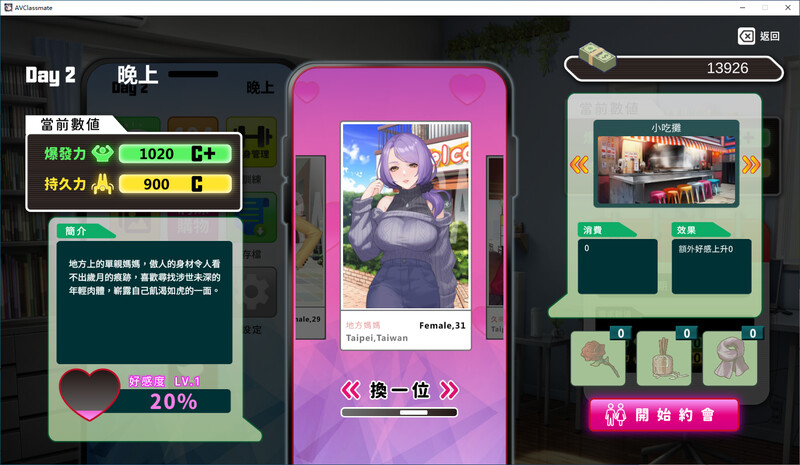 每个时段可以进行【打工】、【训练】,提升自己的持久力、爆发力,来获得异性青睐,