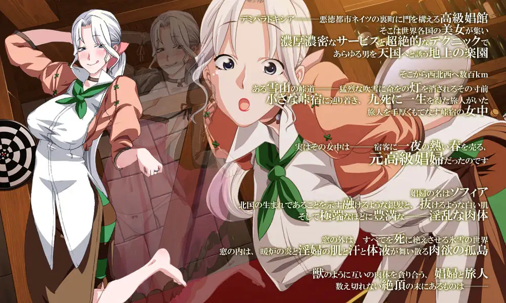你 被困在山隘的一家客栈里,奄奄一息,于是 娶了身材丰满、美艳动人却又有些愚蠢的 女仆“索菲亚”——她实际上是一位前高级妓女——作为你一夜的妻子 。日复一日,夜复一夜,你们像野兽般吞噬彼此的身体。