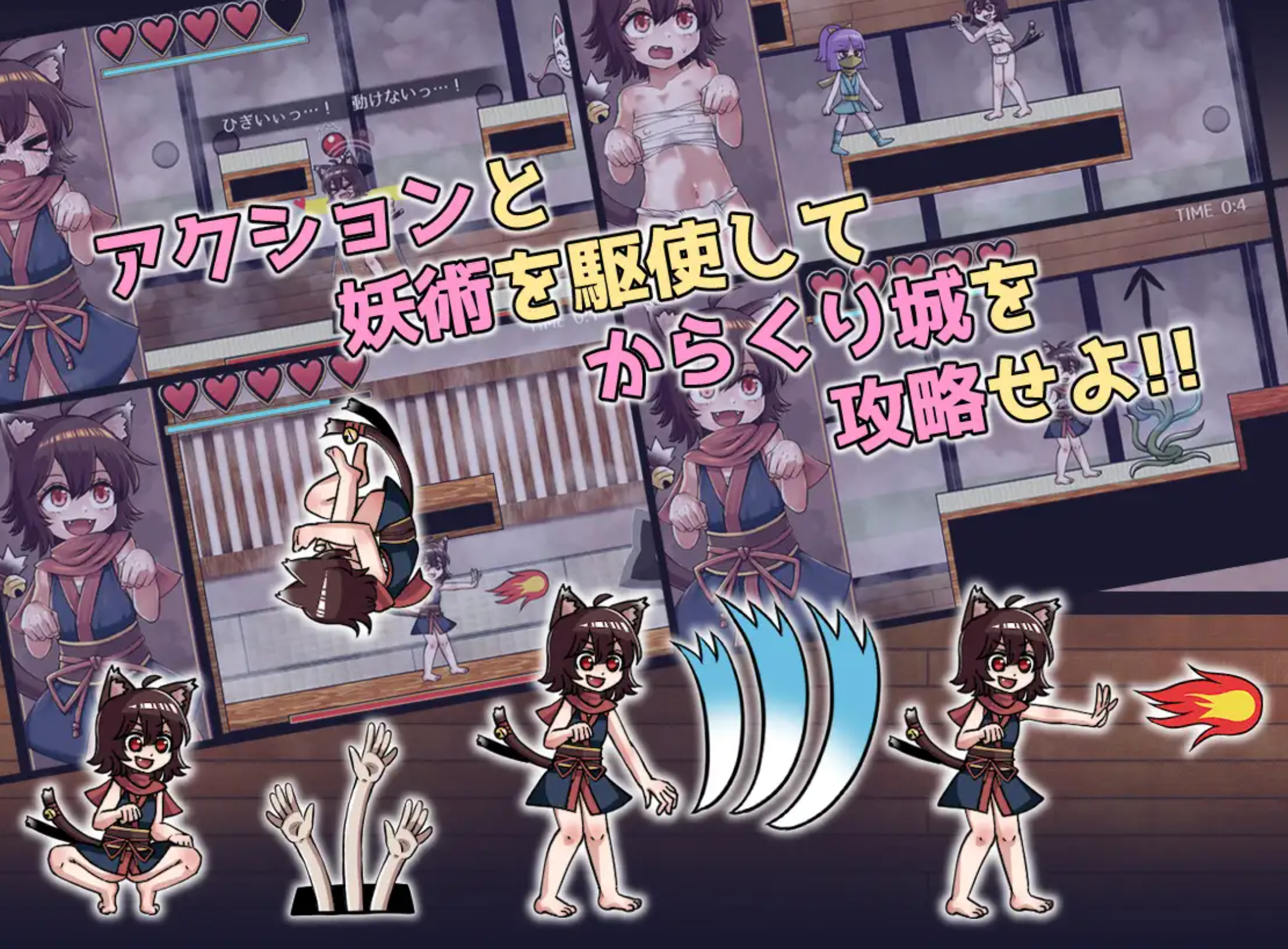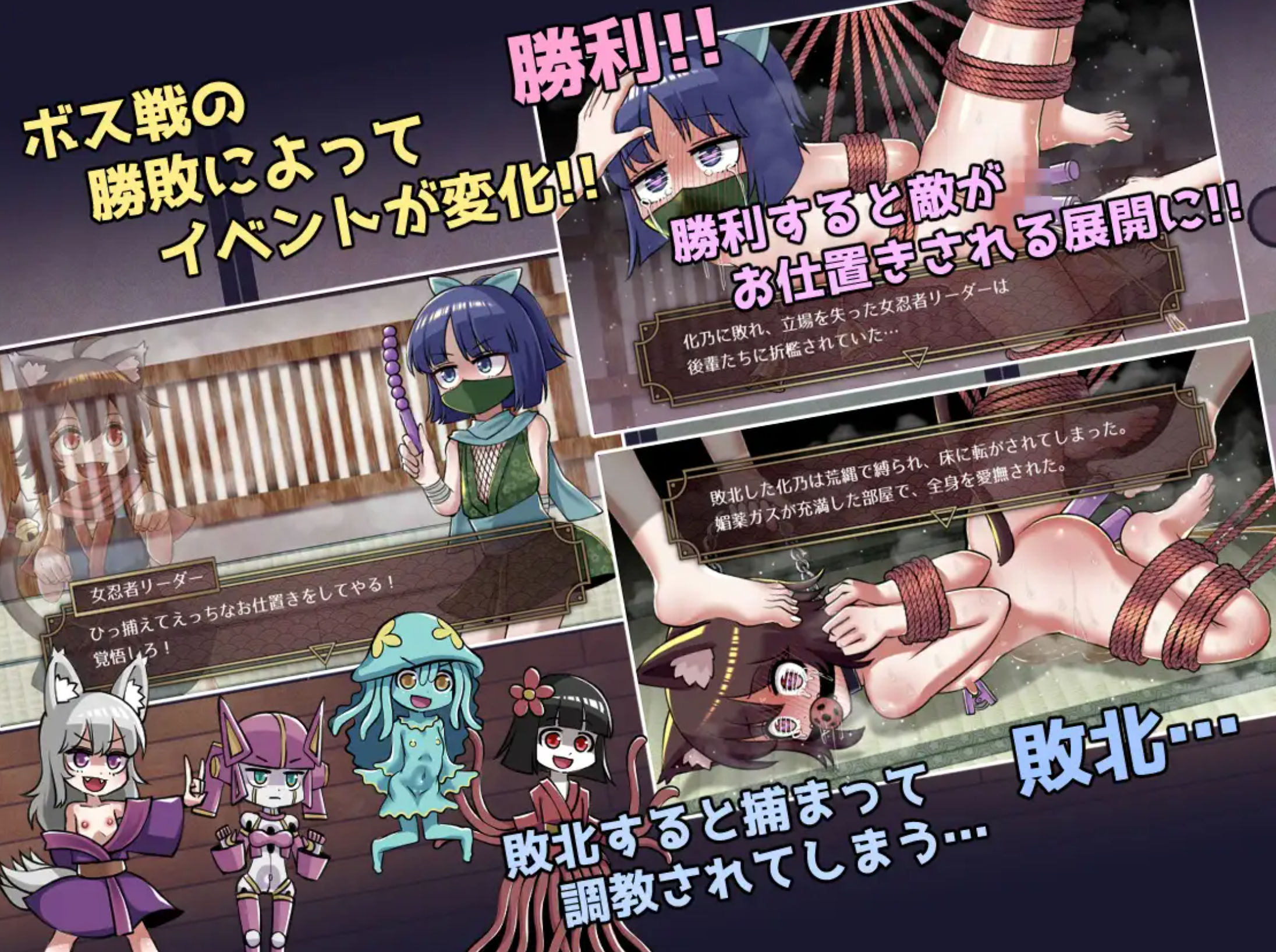 为了夺回被邪恶忍者军团盗走的宝物,猫又少女“化乃(かの)”向充满机关的色情宅邸发起挑战!
